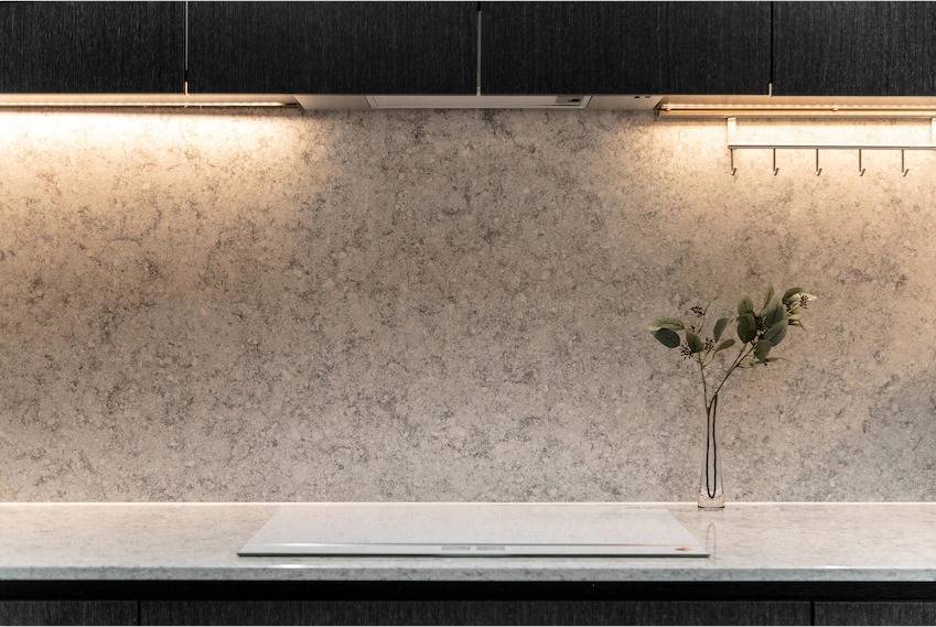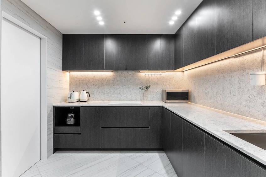 对于男业主而言,理想的厨房不仅要颜值高,充足的收纳空间同样不可或缺。为满足业主需求,厨房采用 L 型布局,最大限度设计上下橱柜,并加入灯带间接照明,营造温馨氛围。