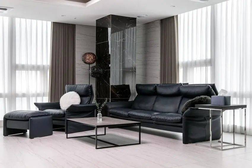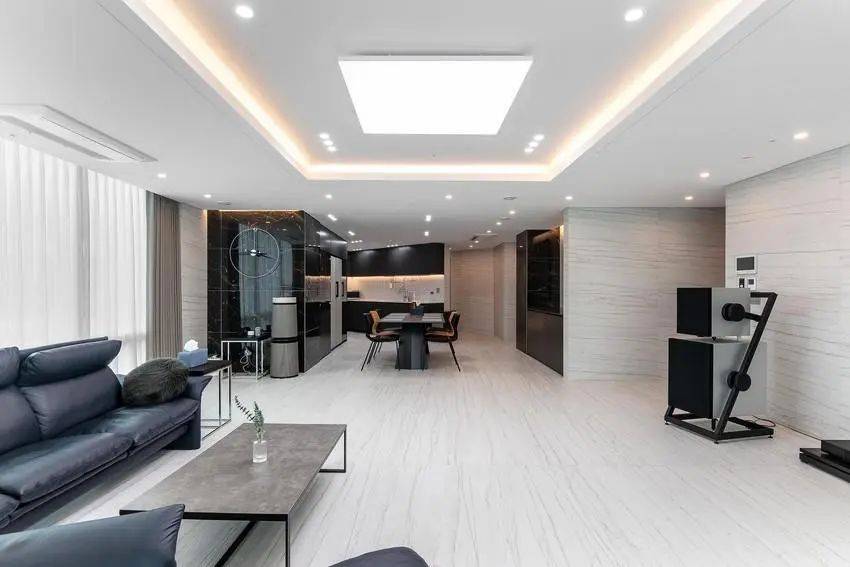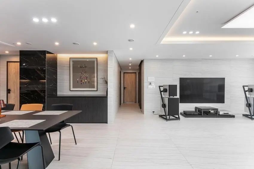 客厅布置了许多深色调的家电与家具,而墙壁与地板则选用明亮的瓷砖与木地板,既不会显得沉闷,又能营造出富有质感的家居氛围。