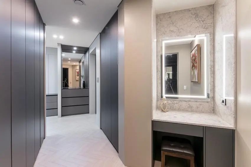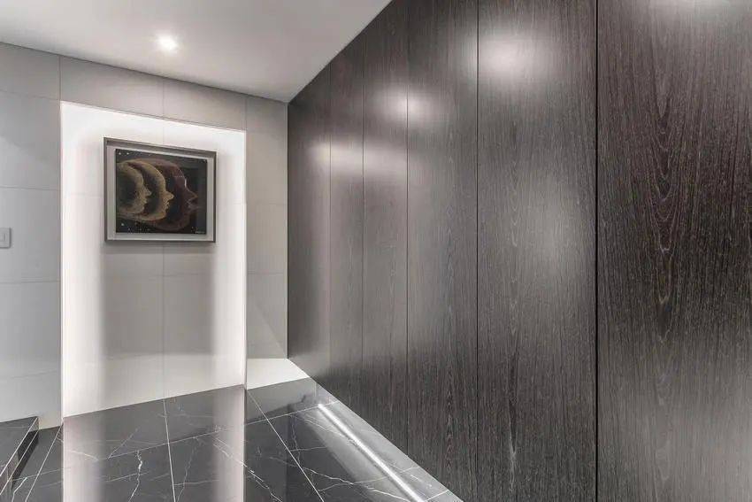 鞋柜选用深色木纹木,增添了沉稳大气的视觉效果。底部留空并搭配灯带,明亮又高级。