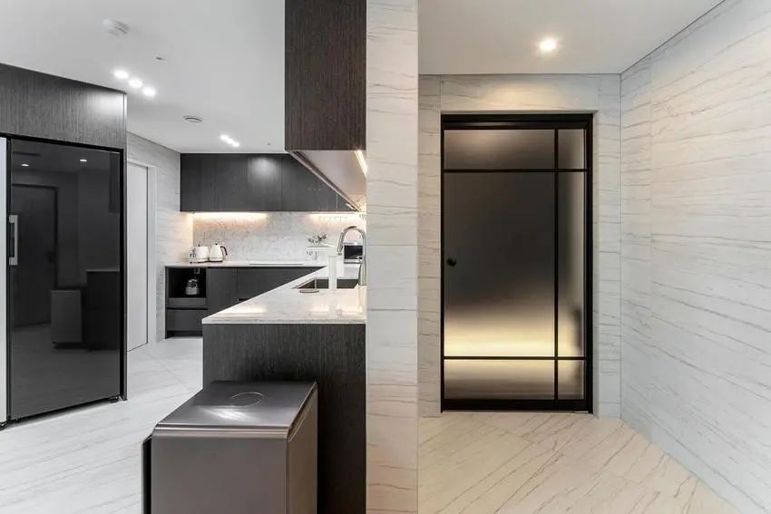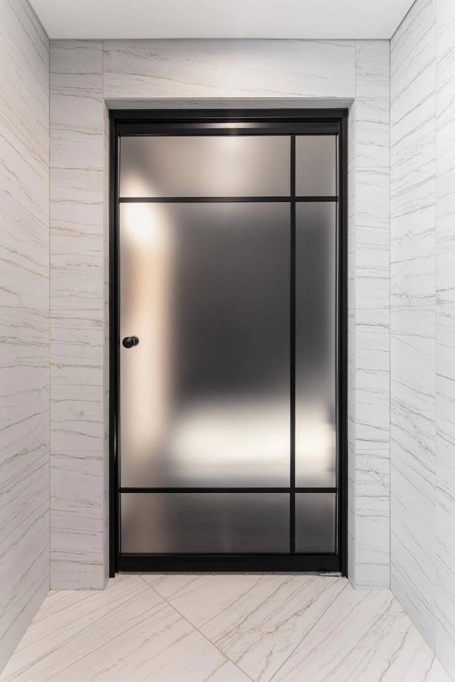 室内与玄关之间的门别具一格,不透明的长虹玻璃搭配简洁的黑色框架,简约感十足。采用密封性良好的平开窗门,提升居住环境品质。球形把手的加入,为冰冷生硬的门廊增添柔和氛围。