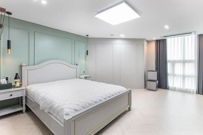 步入卧室,宽敞的空间令人眼前一亮,而卧室背景墙更是点睛之笔。床头采用薄荷色乳胶漆涂刷,为质朴的空间增添一抹清新色彩。