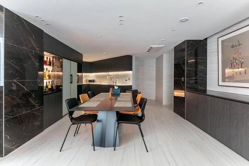 不仅厨房收纳做到极致,餐厅亦是如此。一张 6 人餐桌置于中央,两侧墙面全部安装柜子,酒柜、展示柜、餐边柜应有尽有,甚至将冰箱嵌入其中,使空间显得格外统一整齐。