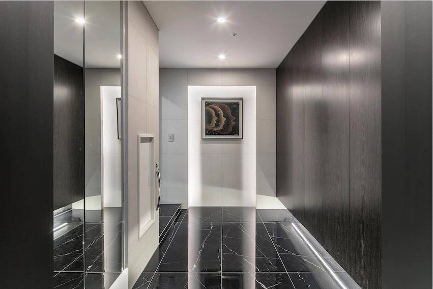 玄关处,地面铺设黑色油光瓷砖,尽显酒店入口般的干练。应业主需求,在与玄关入口相对的墙面,以灯带和瓷砖为装饰,打造如艺术廊般的挂画区域,让空间呈现出艺术品般的高档质感。