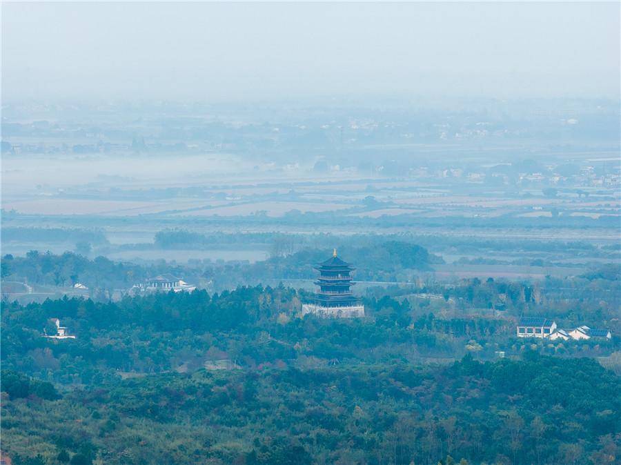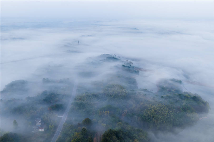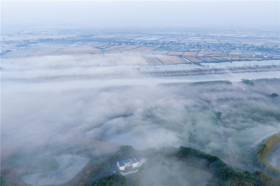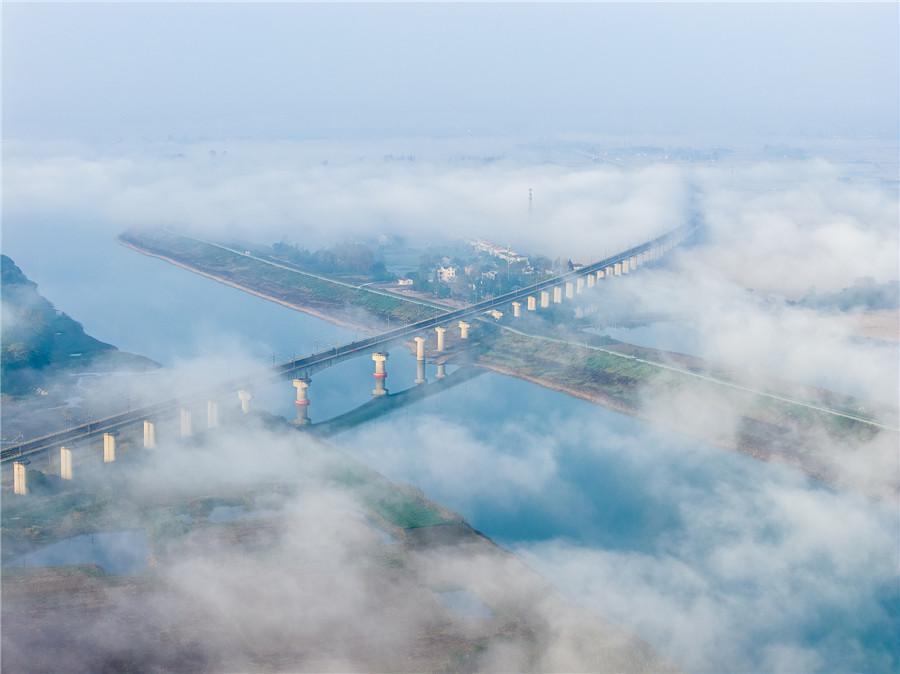 11月2日,安徽省池州市杏花村文化旅游区晨雾轻盈缭绕,山峦、田园与铁路在云纱中若隐若现,宛如一幅浑然天成的水墨画卷。(何先发)