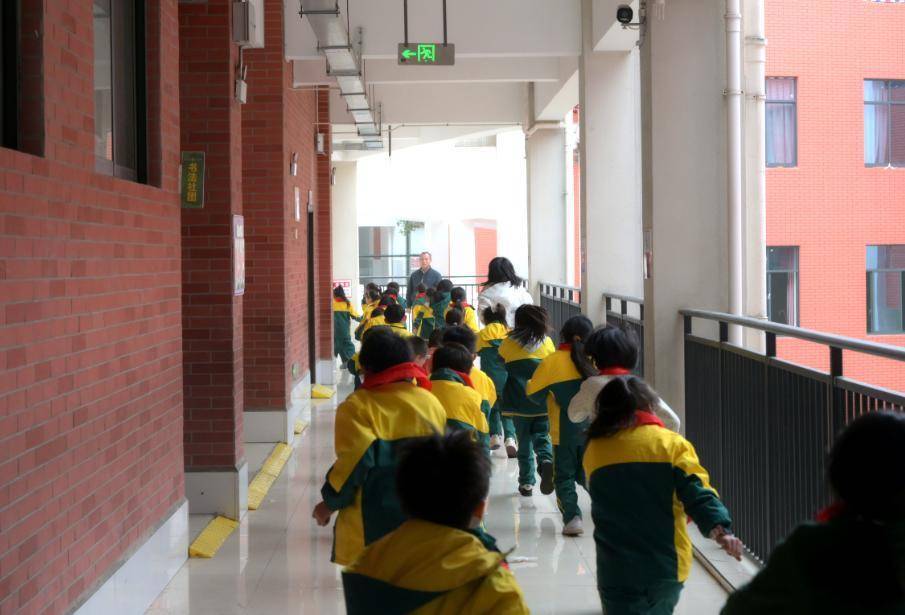 警报声响起,全校师生弯腰低姿、手捂口鼻,遵循预设疏散路线逃生。